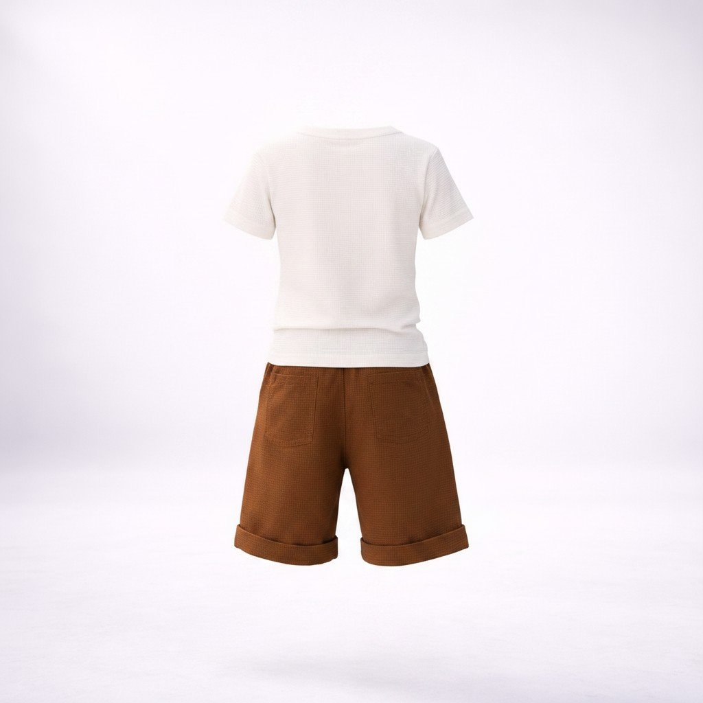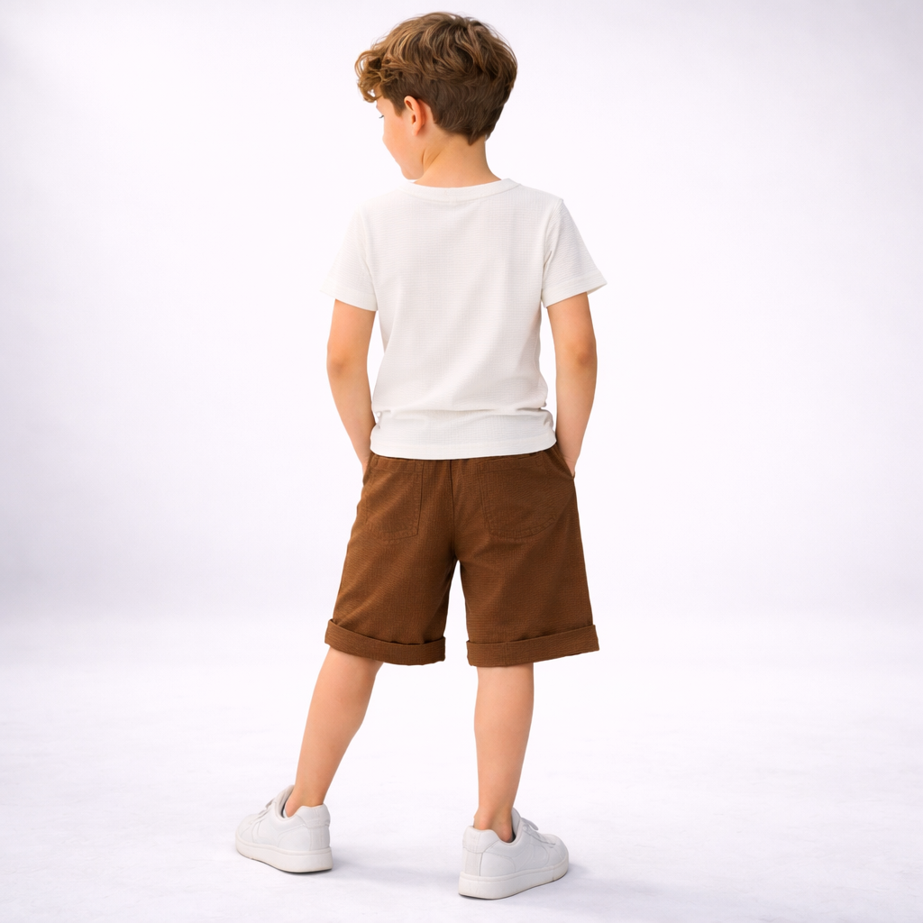 The matching cocoa brown shorts complete the coordinated look perfectly. Designed with an elastic waistband, they offer a secure and flexible fit that adjusts comfortably throughout the day. Side pockets add convenience for small essentials or simply a casual relaxed pose. Rolled hem detailing gives the shorts a neat and fashionable finish that elevates the entire set.