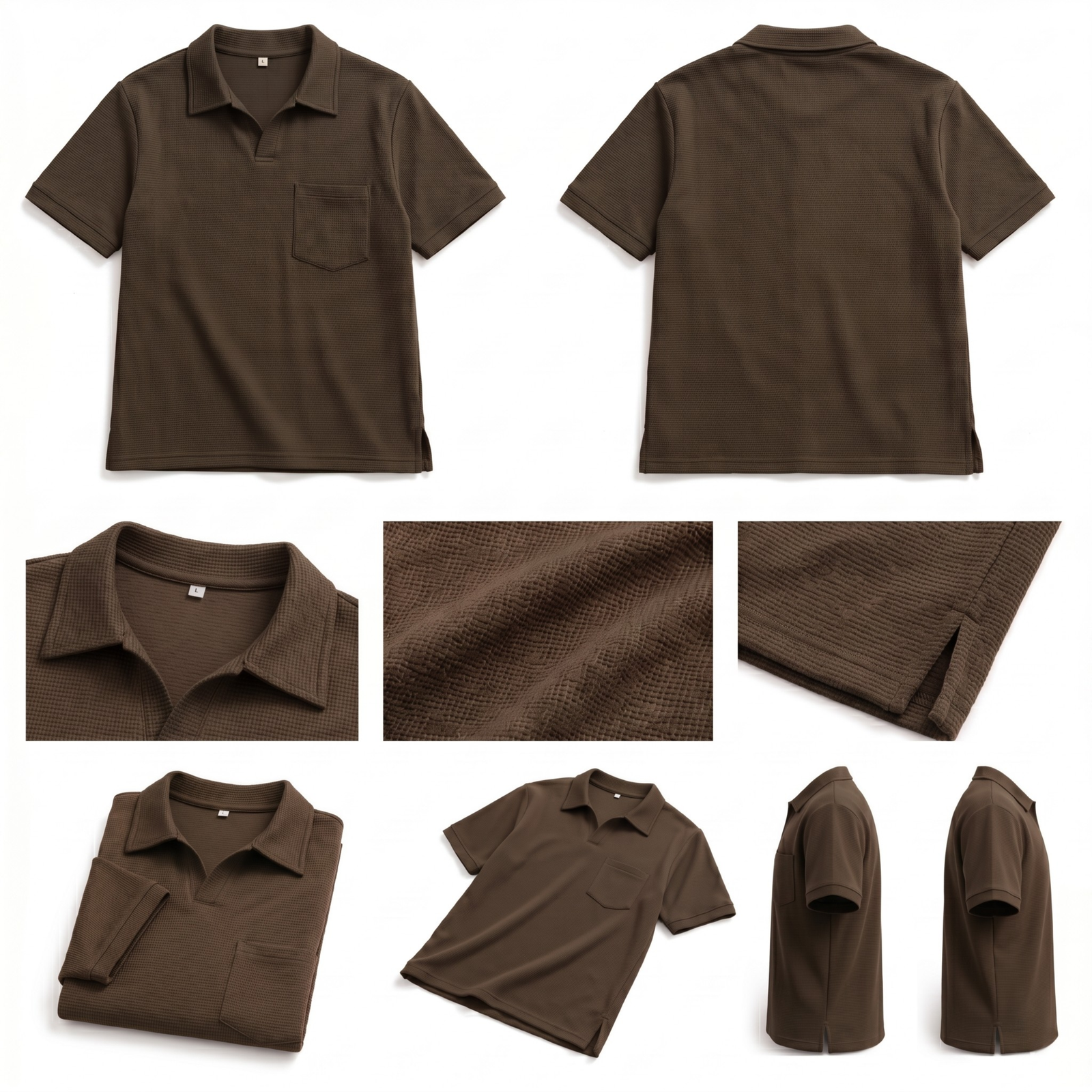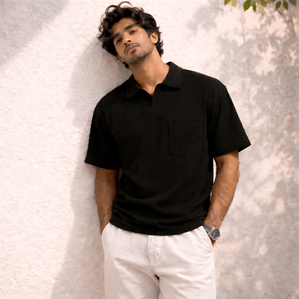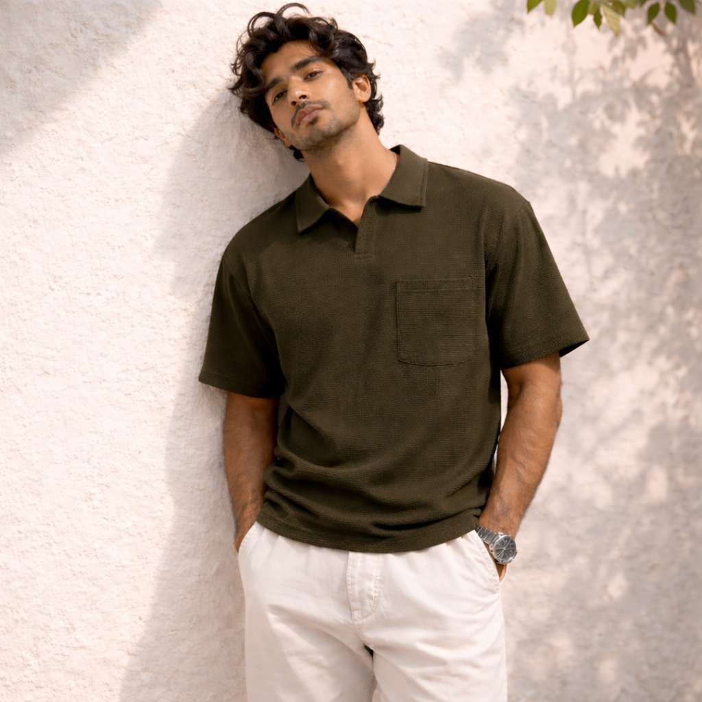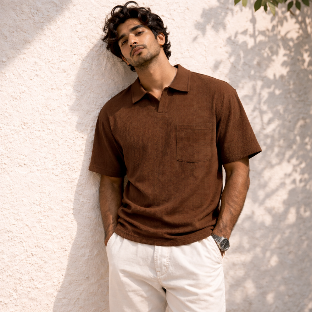 Versatility makes the MochaHaven Textured Pocket Polo a standout piece in any wardrobe. Pair it with crisp white trousers and loafers for a resort-inspired luxury look. Wear it with jeans and sneakers for a stylish everyday outfit. Match it with chinos and a watch for smart-casual dinners or evening occasions. It transitions seamlessly from daytime comfort to night-time sophistication.