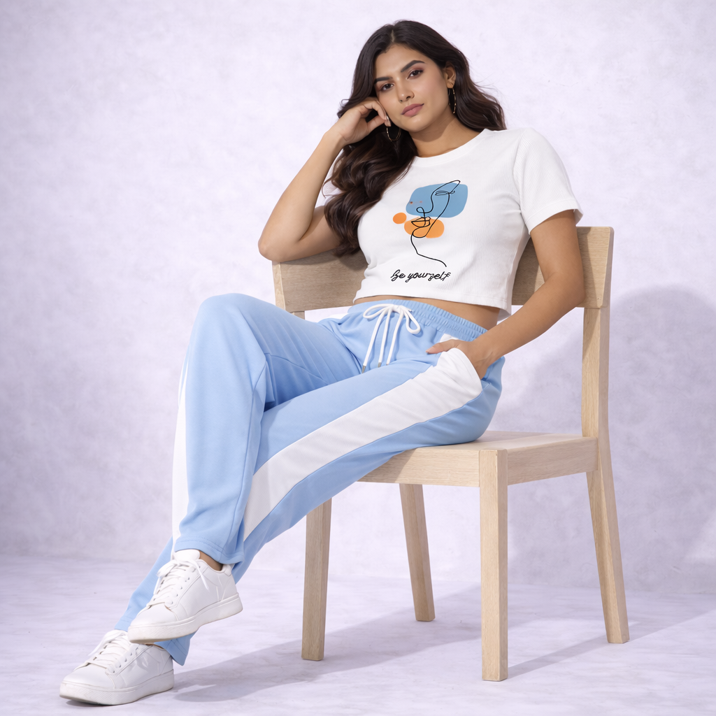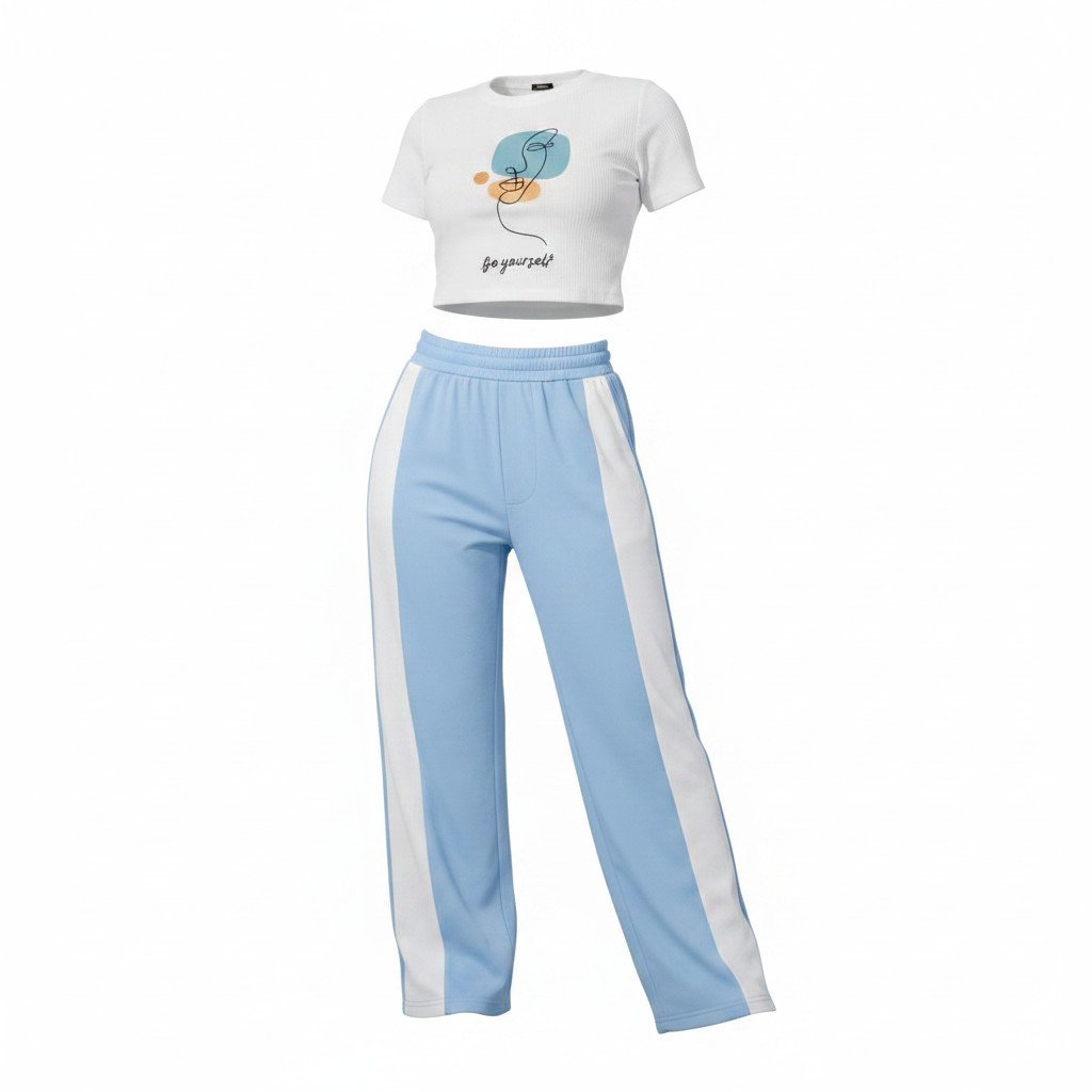 The soft sky blue and white color palette gives the outfit a refreshing and youthful personality. Sky blue adds calm elegance and modern freshness, while white accents create brightness and contrast. This beautiful combination is easy to style and works perfectly across seasons. It pairs effortlessly with sneakers, sandals, slides, or statement accessories for multiple styling moods.